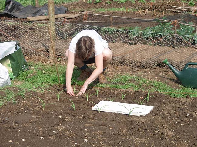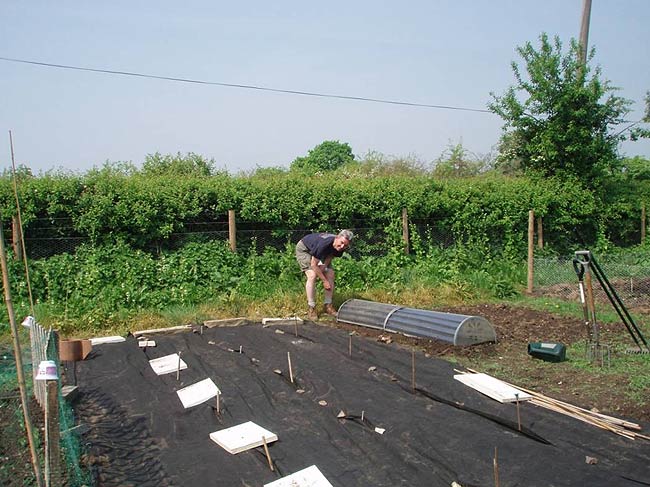 Over the past few days we have noticed that the peas are being nibbled by something.  The netting has not been moved suggesting that it is not rabbits, so we wondered if it was slugs or snails.  We set off down to the allotment today to find that with only a few slug trails around the peas it is unlikely that they are the culprits.  Our neighbour suggested mice, so we will get some prickly material from pruning holly, pyracantha and berberis at home to provide a barrier.  He also recommended a place to get rabbit fencing at a reasonable price and explained to Lynn that he has horses and therefore a ready supply of muck, which he is happy to share.  One of the nice things about gardeners is their willingness to share, both ideas and materials.  Our onion sets came from our swimming teacher (http://www.swim-club.co.uk/).