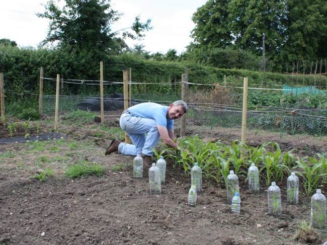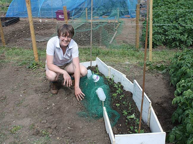 Today, we had a really busy day on the allotment today.  We have finished the trench for the rabbit fencing, so I can start to get that up on Monday.  We did plenty of watering, weeded the sweet corn, potato, onion and pea beds and Lynn created a walled sanctuary for one batch of the sweet peas.  The photos below show that there is definite growth, albeit against a back drop of pests.  Hopefully the fence will help with the rabbits, we think that they have had a go at the sweet peas and there is plenty of evidence of rabbit droppings to confirm this.