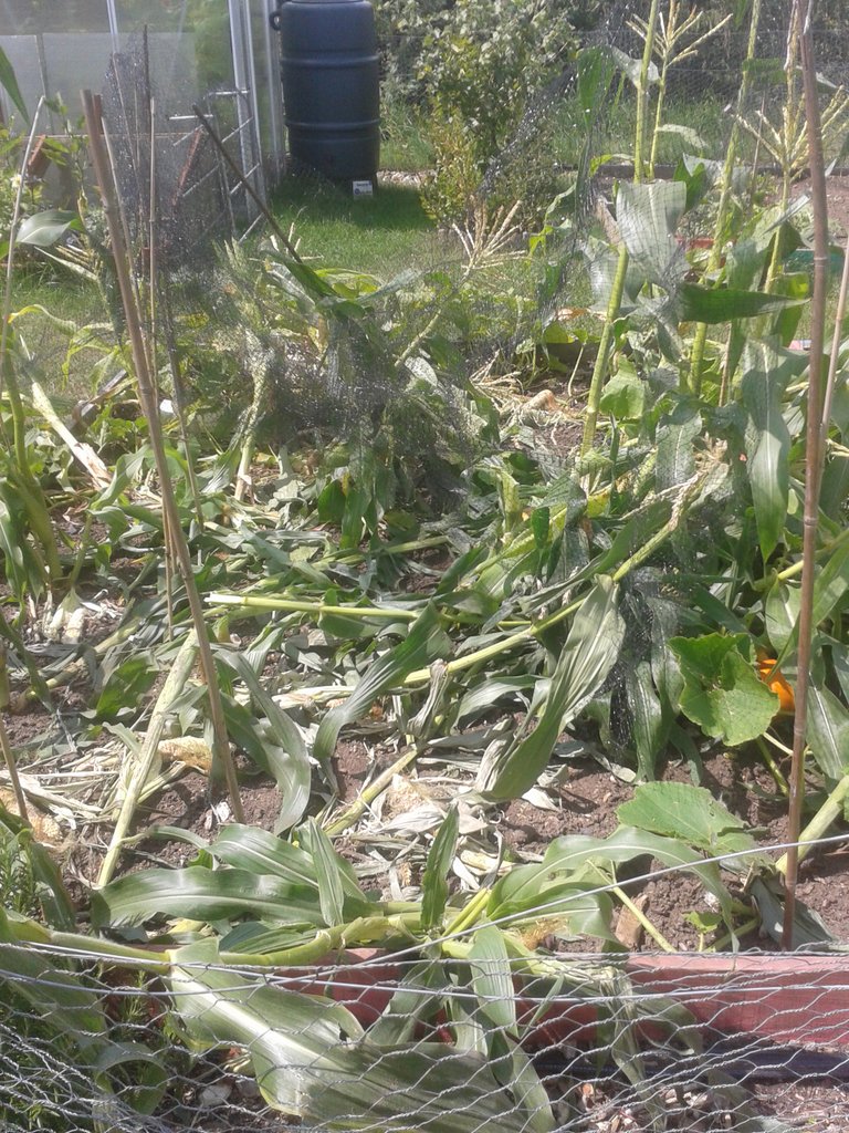 The sweetcorn got trashed last year, along with virtually everyone else’s at the allotments. Inititially we thought that it was deer that had done the damage, although the final consensus on the allotments was that it was badgers, as someone had tracked the trail of debris. The animals had in some cases dug under fences, but in our case actually clambered over the fence, pulling it over (along with a couple of fence posts) in the process.