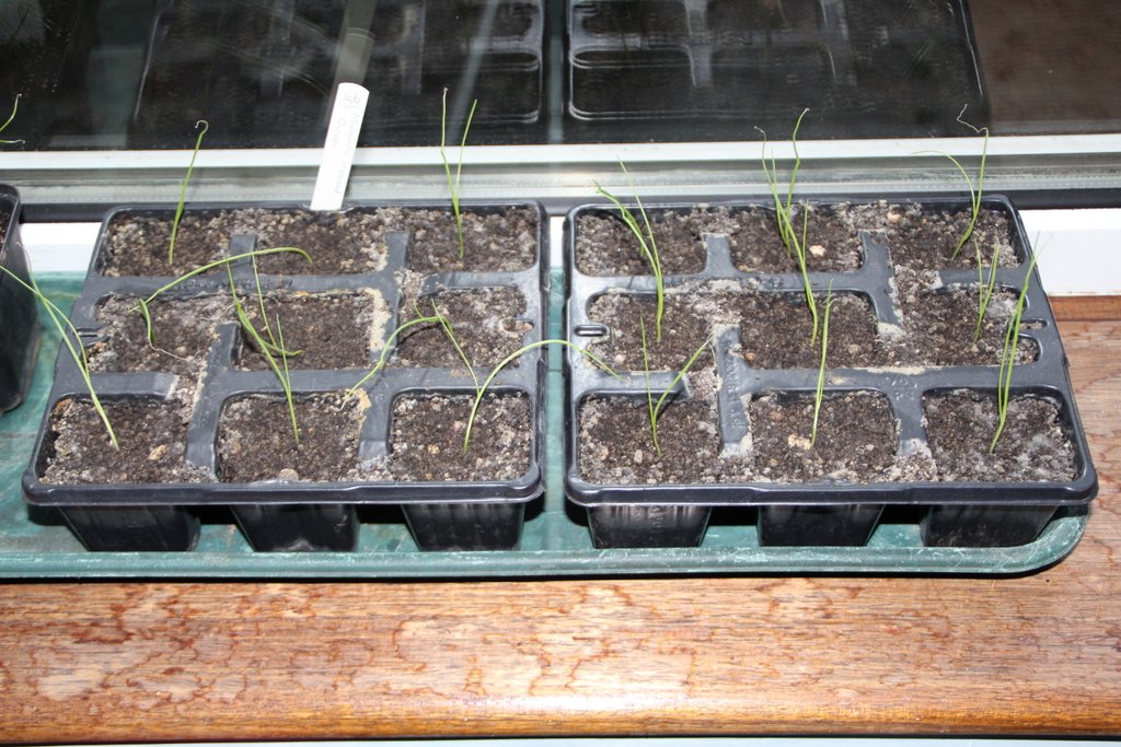 The Mammoth Improved Onions are the first to show (after 8 days) and germination rate was 80%. Mammoth Red Onions are a little later (after 11 days) and germination rate was slightly lower, 75%. I think the fast germination and lower germination rates are caused by my seeds being on the bedroom windowsill rather than the constant, controlled 12 C recommended. Robinsons recommend potting off the seedlings into a slightly stronger JI compost at the crook stage. Since my seedlings are already in quite roomy 9 berth modules, I decide to leave them alone.