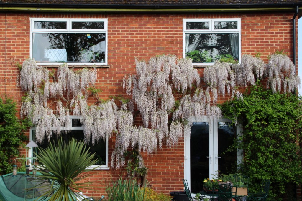 As well as being busy in the garden, make use of the longer daylight hours to enjoy it. Sometimes, especially when you keep reading lists of jobs that you ought to be doing, gardening can turn into a list of chores. Don’t let this happen, take the time to sit, relax and enjoy looking at the results of your labours! Sometimes this might be the result of following earlier tips. For example, this is our Wisteria that we pruned back in February. what the picture doesn’t give you is the glorious scent that fills a warm evening. Perfect with a glass of whatever you prefer.