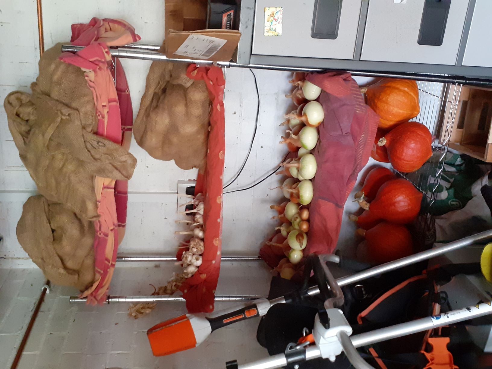 In the kitchen garden it is also a time for enjoying the fruits of this year, while preparing for next year. Harvest hard-skinned squashes and pumpkins before the first frosts ready for storage, putting boards under the ripening fruit helps to protect them from rotting if the soil gets damp. In our garage they are currently joined by potatoes, onions and garlic.
