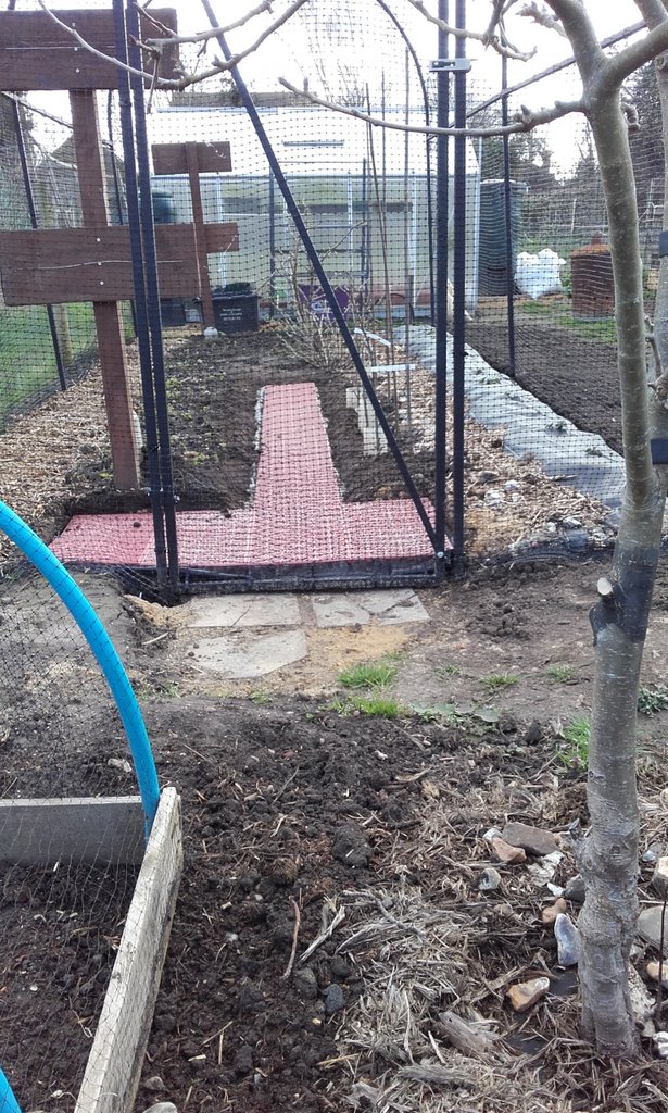 It has been another pretty soggy autumn/winter, which has slowed down our efforts to get the new allotment plot into shape.  We have however, managed to finish the latest (and last?) major construction project – a fruit cage.  There are some soft fruits that simply have to be protected from birds if you are going to get a decent crop and some of our favourites, like strawberries and redcurrants fall into this camp.