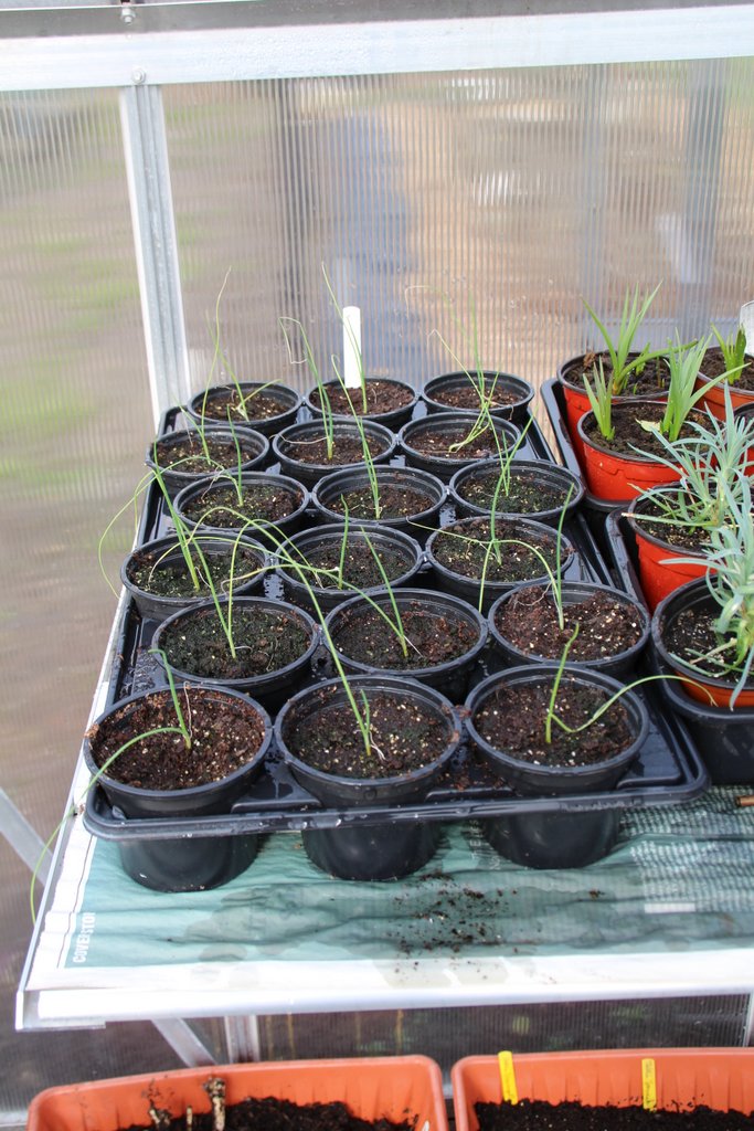 By late March, every spare inch of windowsill and staging in the greenhouses at the allotment is occupied with seedlings. Consequently, the onions are amongst the first crops to go into the cold frame for hardening off. After three weeks in the cold frame, there is little difference in size between the two sowings.