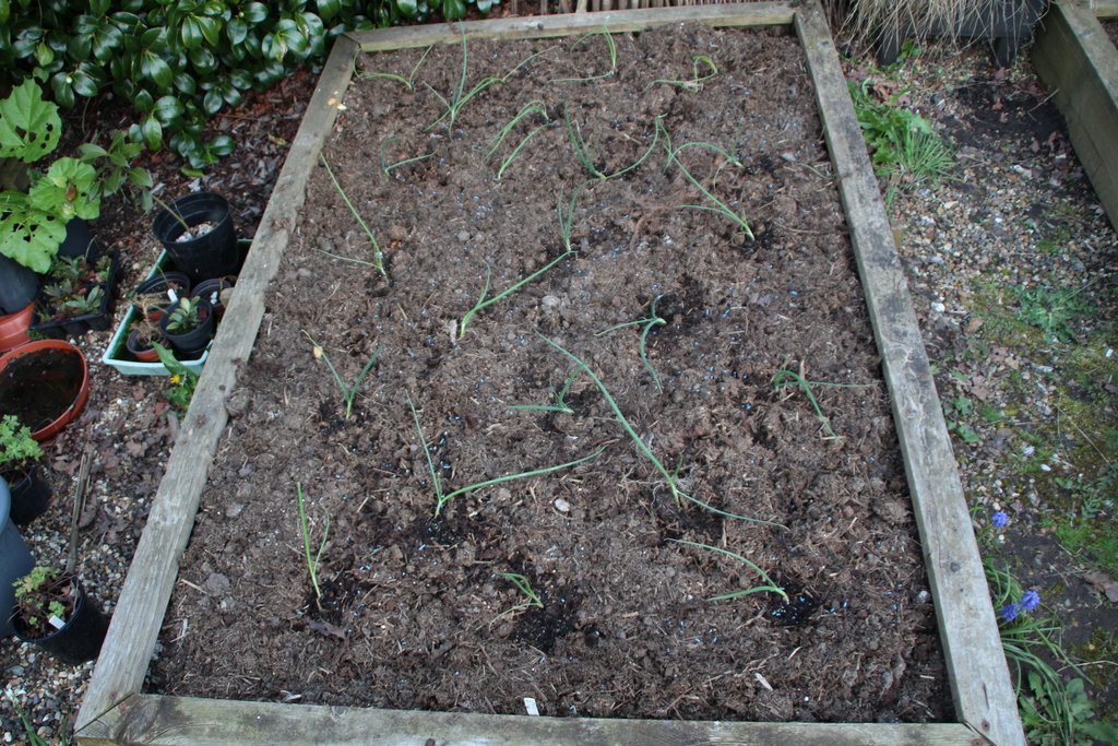 Competition for space in the cold frame is hotting up by the middle of April, so even though it is a little earlier than recommended by Robinsons, my precious onion seedlings are planted out on 19th