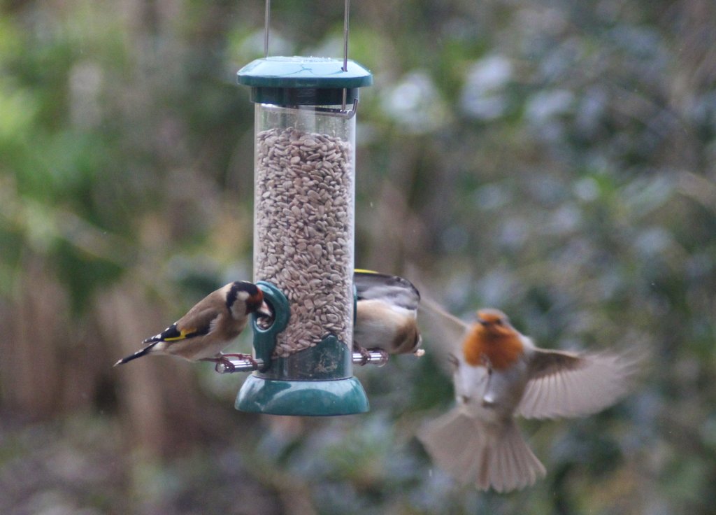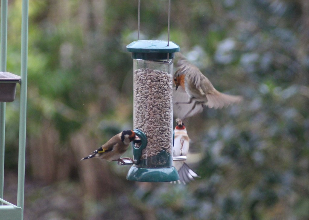 The robin however, was less pleased to see the goldfinches as these two pictures show.