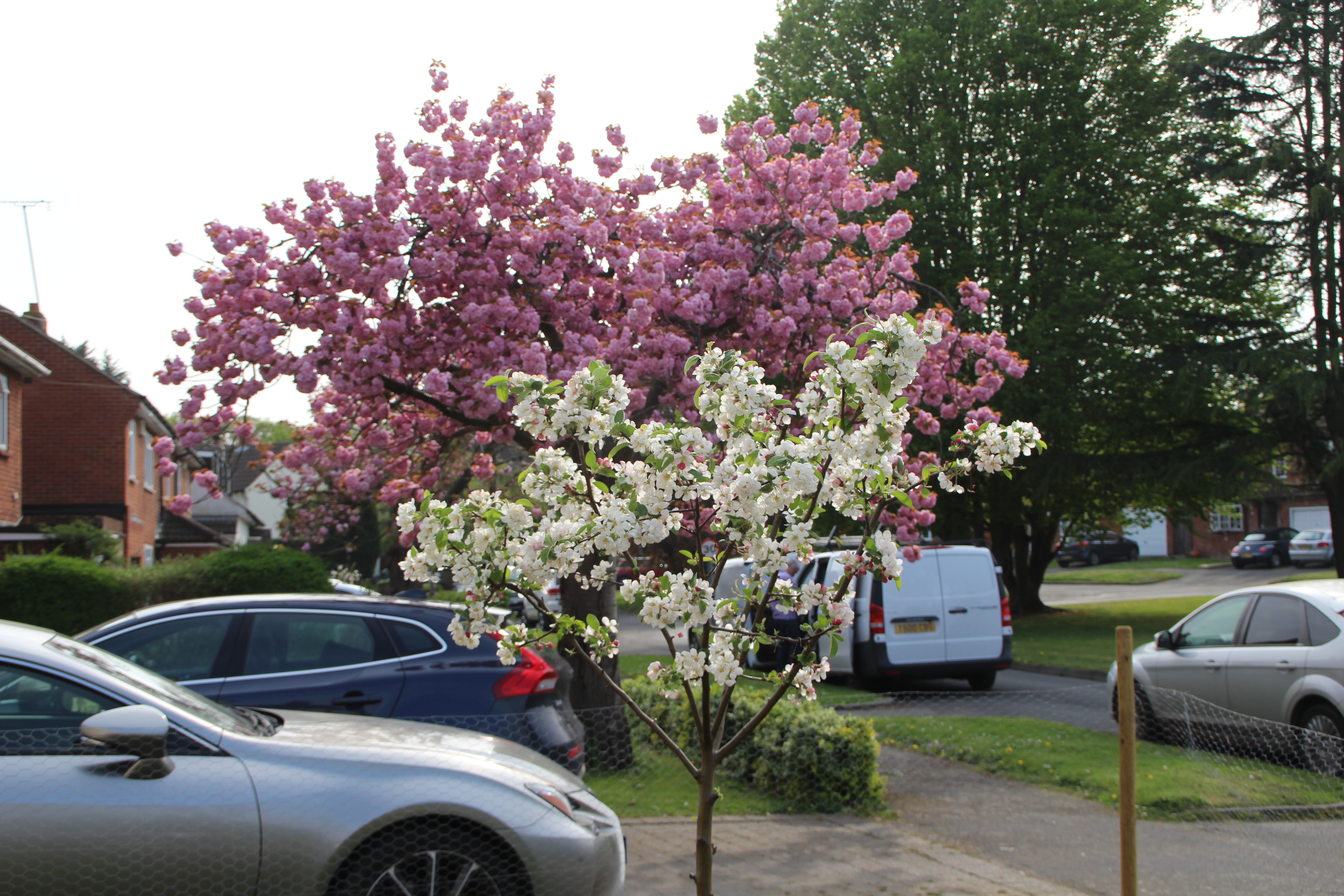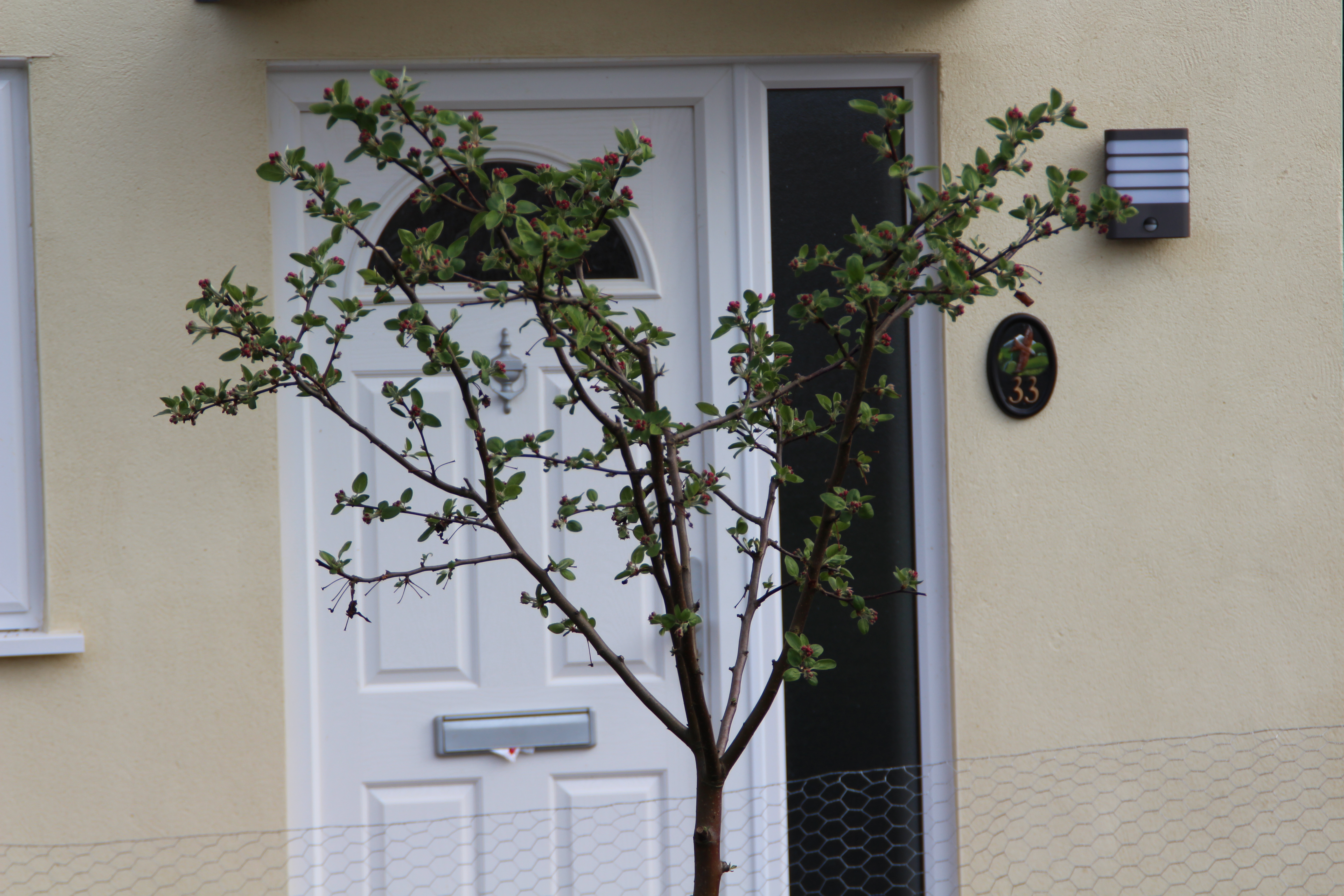 The front garden is starting to take shape.  The new grass is germinating and the crab apple has survived being uprooted and moved and is now in full blossom.