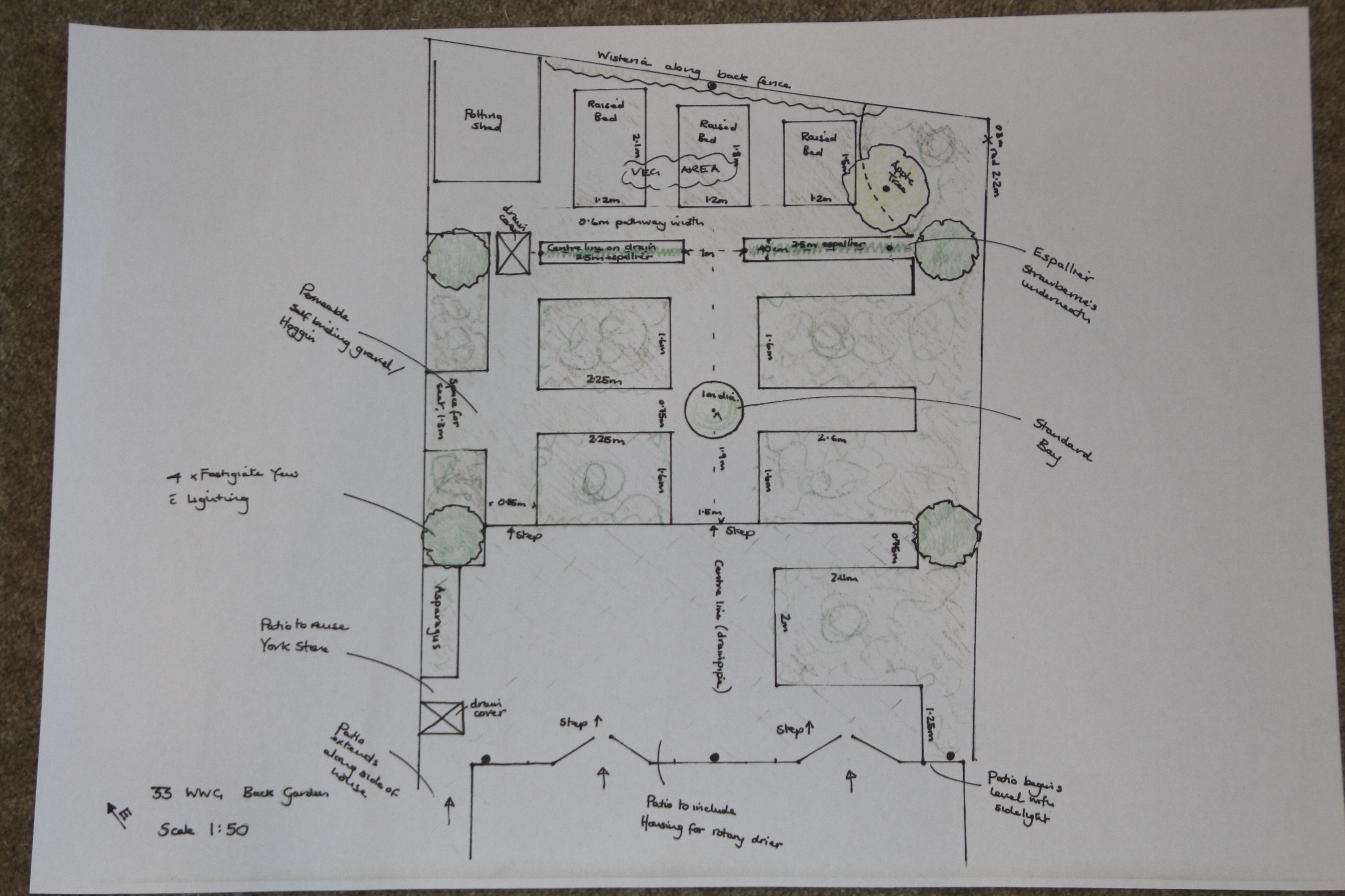 At the end of the school Adam ran a clinic on the garden issues facing all of the participants and helped us to get to grips with an overall structure.  A swift photo of his sketches then got turned into a more detailed plan.
