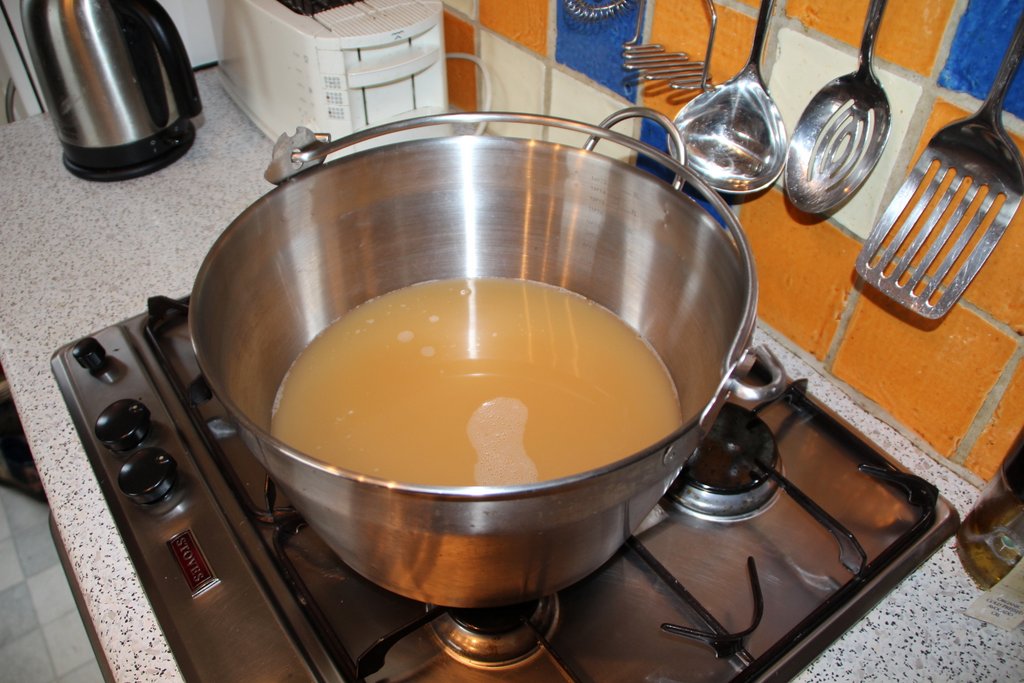 Measure juice into pan and mix with 12 oz. sugar for each pint of juice (we use preserving sugar but any white sugar will do).  Add juice of 2 lemons. Heat gently and stir until sugar is dissolved. This is when the colour starts to change.